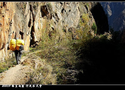 其实一路走下来,感觉并没有丽江那人说得那么险要。或者说,只要没有恐高症,走走这种路不失是种享受。不过但凡有恐高的同志就还是要小心了,因为所谓的悬崖之路,不是几分钟迅速通过的事情,而是要一直走一直走,一直走上几个小时的路途,中途某些地方还要快速通过,以防头顶的山石滚落砸到人。