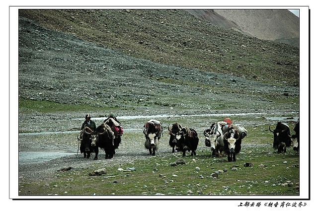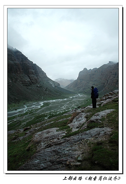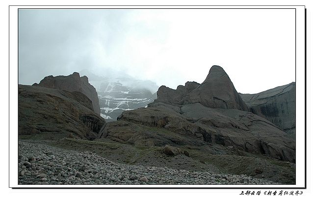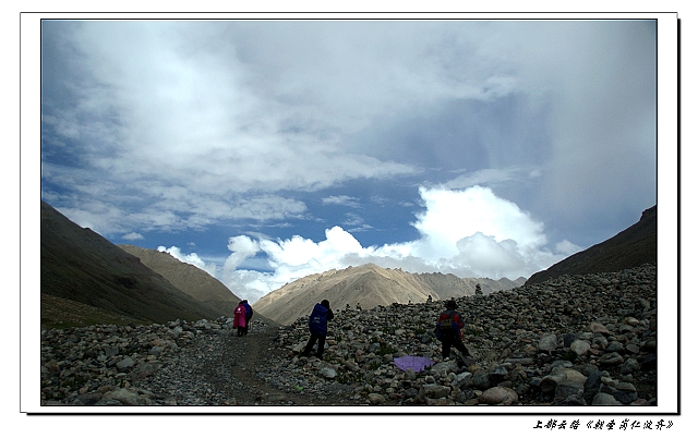 路上遭遇了牦牛群,都是运送物资的, 牦牛总是安静的动物, 见人靠近就躲得愈远。 原先网上说有很多印度人习惯骑马转山,我们却没有遇到。不过我们遇到了一家磕长头转山的,56公里的路,我们徒步尚要满满的两天,他们不知要花费多久才可以完成。 往往和老海过去留了些费用,算是资助。 快出拉曲峡谷的时候天气有些放晴,抬头居然能看见冈仁波齐的一点身影, 搞得我有些激动。