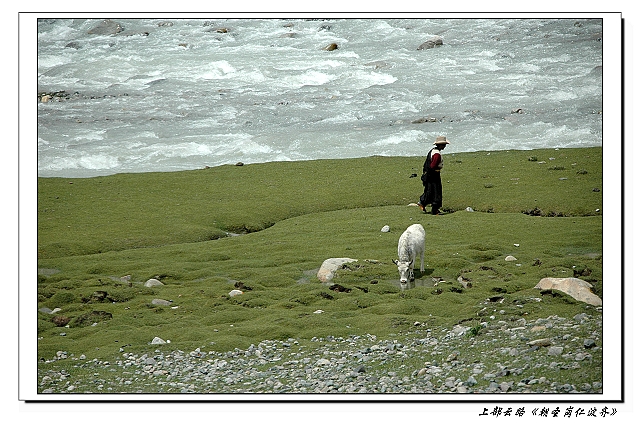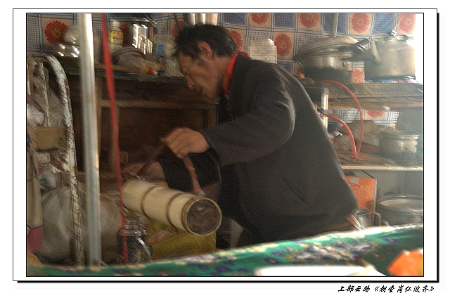 峡谷口是个帐篷区,大家闪进帐篷休息, 向帐篷主人叫了壶酥油茶,这是我们第一次看见酥油茶的制作过程:向一个狭长的酥油竹桶内填入酥油,再添水,再像打气筒一样用一根什么东西伸伸拉拉,大概是搅拌作用吧,然后酥油茶就做好了。 休息的时候进来个老外,带着向导, 向导的外观极具狂野, 修长的身型并着头发蓬蓬的打着卷, 感觉是奔波浪荡了很久的迷途者。 LAN在这里居然坐着打了个盹,自述功夫是练就自北京地铁。