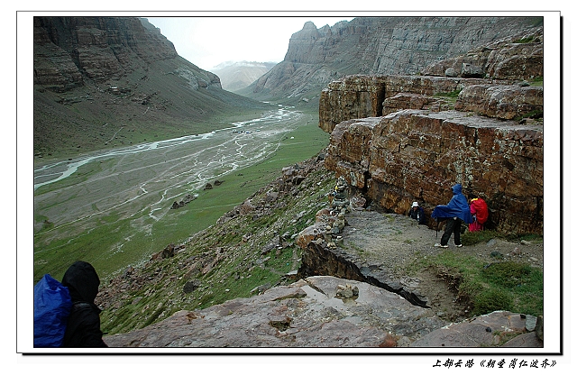 一路人狗相互陪伴着上了山, 在色雄开始爬升。 爬山我不行, 上升的时候我永远是发挥谦让精神的“你们先”, 然后一堆人在山上目送我一点一点往上蹭。身后是一片经幡群, 上山的路上也散落着不少衣服,遗弃了很久, 感觉像是天葬台的样子。 不知道是不是受到高反的心理作用, 再加上小雨打在脸上扰人, 凉冰冰的, 感觉爬起来好累, 走两步就喘。 作为收队的silence很负责, 在后面陪我一点点的墨迹, 几次让他先走, 他都一脸不在乎的说:“没事,我也看风景呢”。 好不容易爬到山坡顶, 却发现不远处又要下去, 大家这才意识到其实这段上升其实是不必要的, 是要沿着河谷走就好, 刚好一队藏人从下面经过, 进了河谷,速度比我们可快多了。 不过爬上来也有好处,就是可以俯视巨大的拉曲河谷。 高处总是风光无限, 天地都是开阔的, 即使天气阴沉, 但并不感觉压抑。 下山是条小路, 有些陡峭, 往往不知抓了什么植物, 手划了个口子, 不大却疼的打紧, 老北从背包里面翻出创口贴给他, 竟把往往感动的一塌糊涂, 从此对老北刮目相看, 由此展开了“缠绵悱恻”的北北和往往的背背故事。