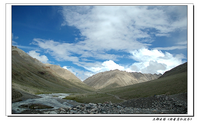 再翻过一个小坡后环境变得更加温馨, 云散开了很多, 好像是穿越到了另一个世界, 河流奔腾而开阔, 散落在岸边的牦牛安闲的啃着青草, 天色转蓝, 阳光中透着午后的慵懒。对于我们这些远道而来的浪子,它们这些“地主”们是不屑一顾的。
